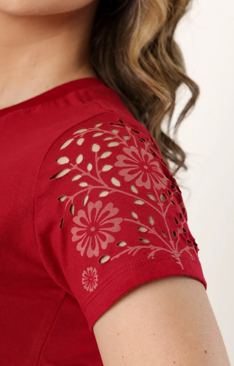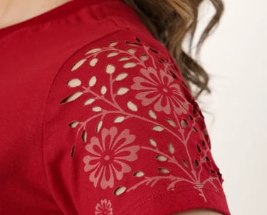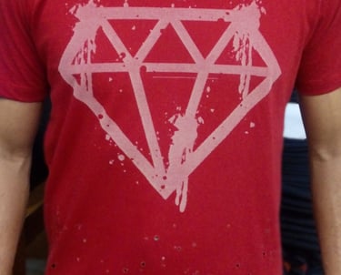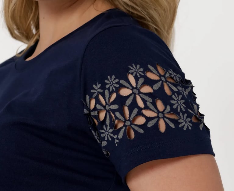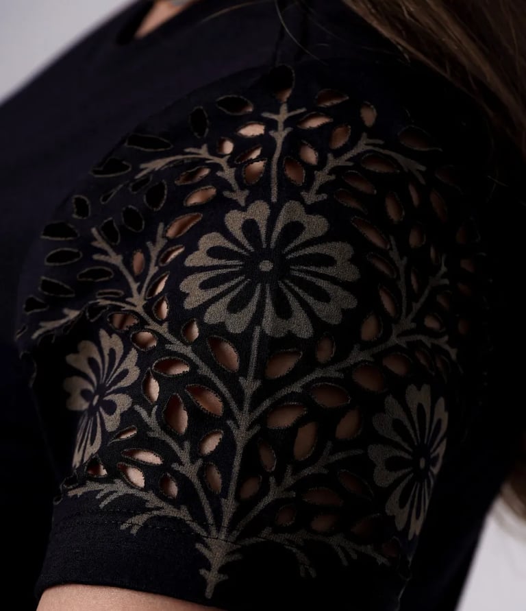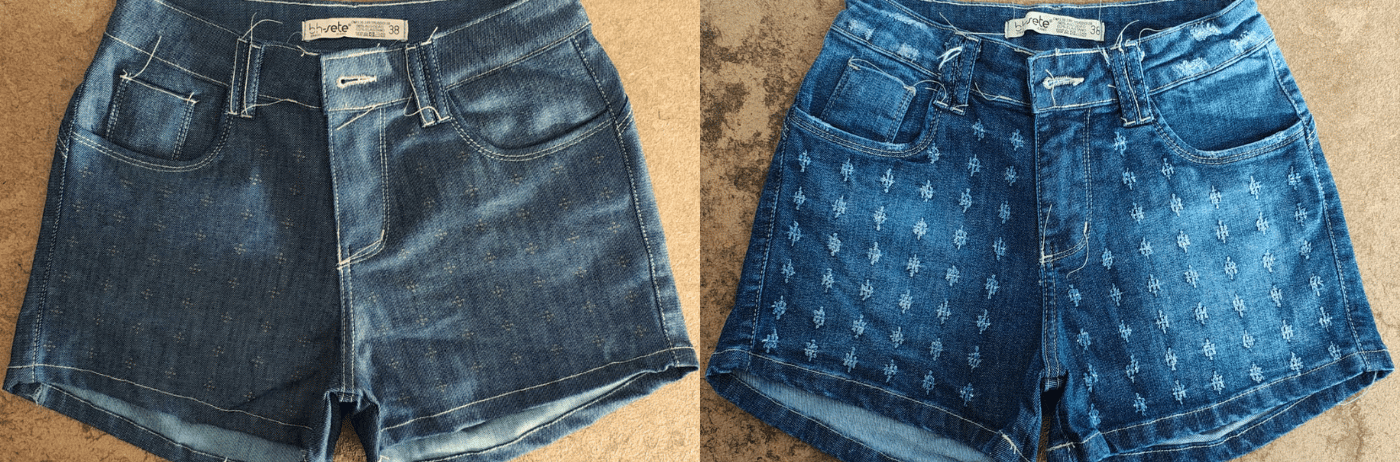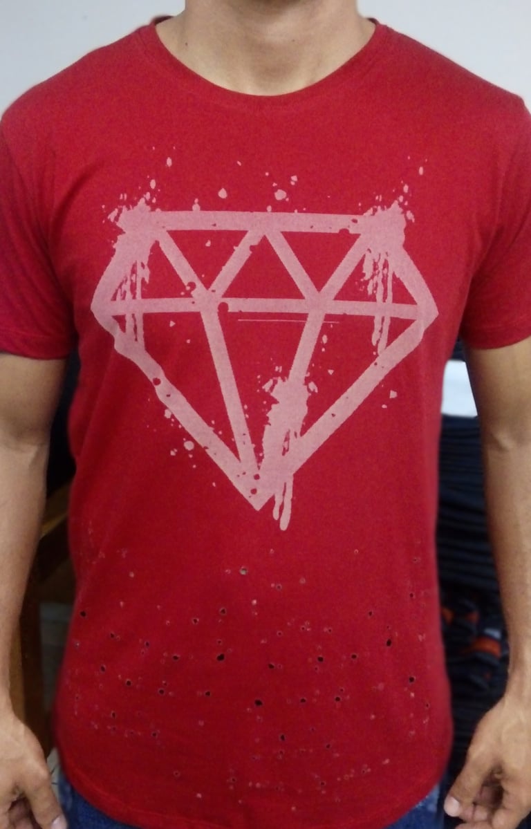 O resultado depende da arte escolhida. No caso de efeitos como o rasgado em calça jeans, conhecido como 'navalhado' ou 'devôre', o tecido não chega a abrir um buraco, apenas ganha o efeito navalhado. Também é possível criar artes superficiais na peça, como mostrado nas fotos acima.